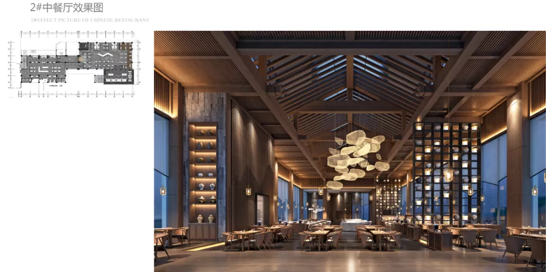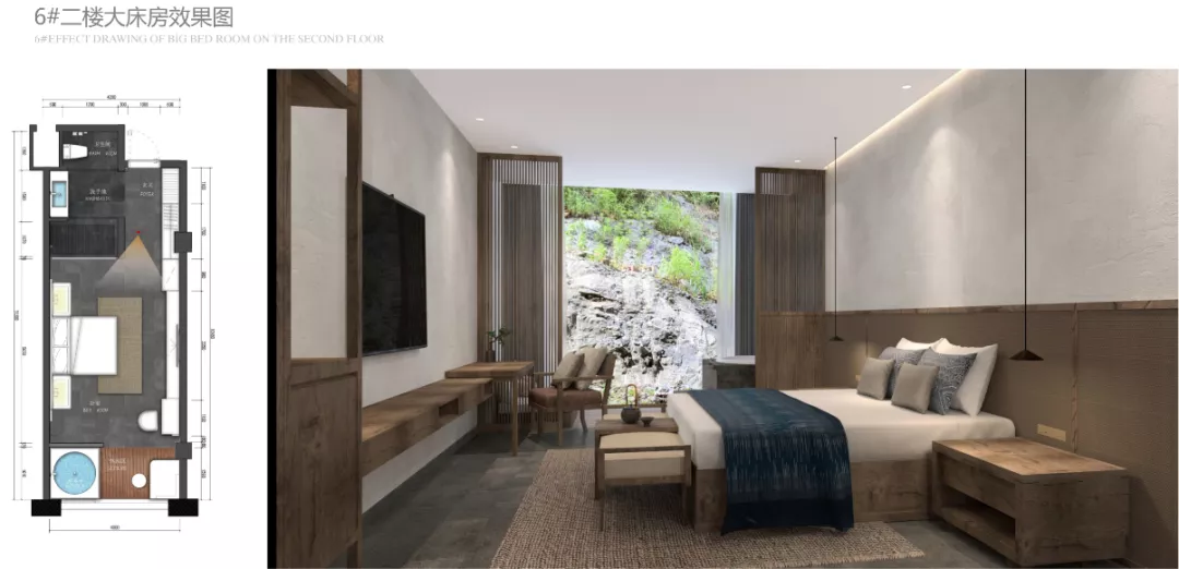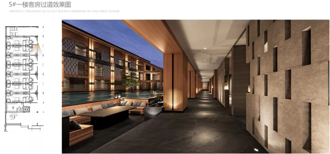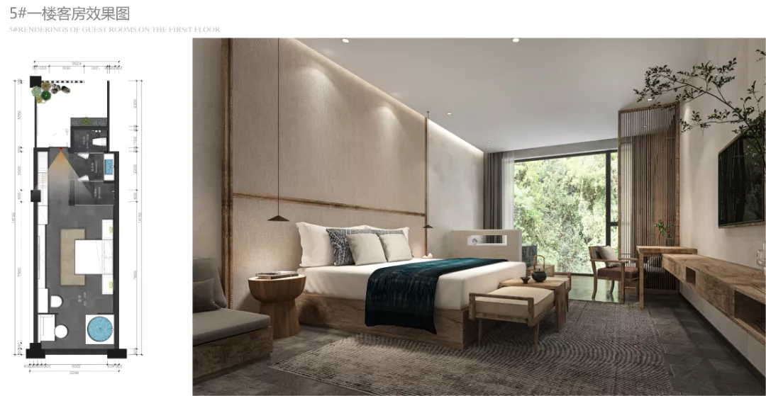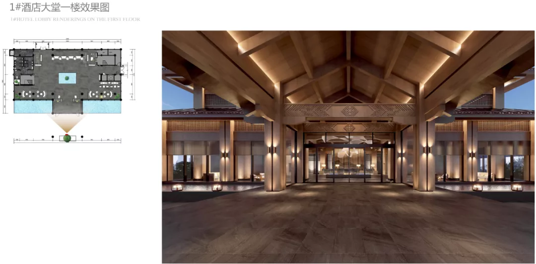 整体设计元素采用原生态的木融合自然,返璞归真,创造出让人身心愉悦的一方土地。充分表现出回归自然,天人合一,修身养性等自然生态理念,没有华丽显贵的色彩,与过多的装饰。酒店功能布局因地制宜,沿公路将酒店包围于山谷中,根据地形高差,运用“山、云、水、光”的设计概念,将酒店与景观结合完美呈现出来。