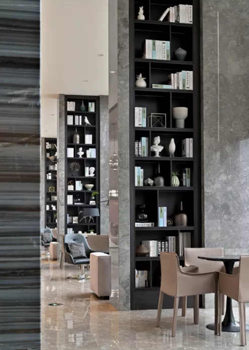 水吧区:水吧延用洽谈区的做法,保持空间现代简洁统一性,白色石材折面成型处理手法搭配黑色石材,精致摆件提升水吧区的品质感。。