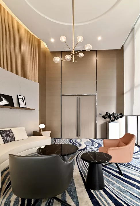 VIP区:VIP室墙面使用木色与浅色硬包,曲面的沙发与地面地毯相呼应,在现代分子艺术吊灯的光晕下,使洽谈的客户更享尊贵感。
