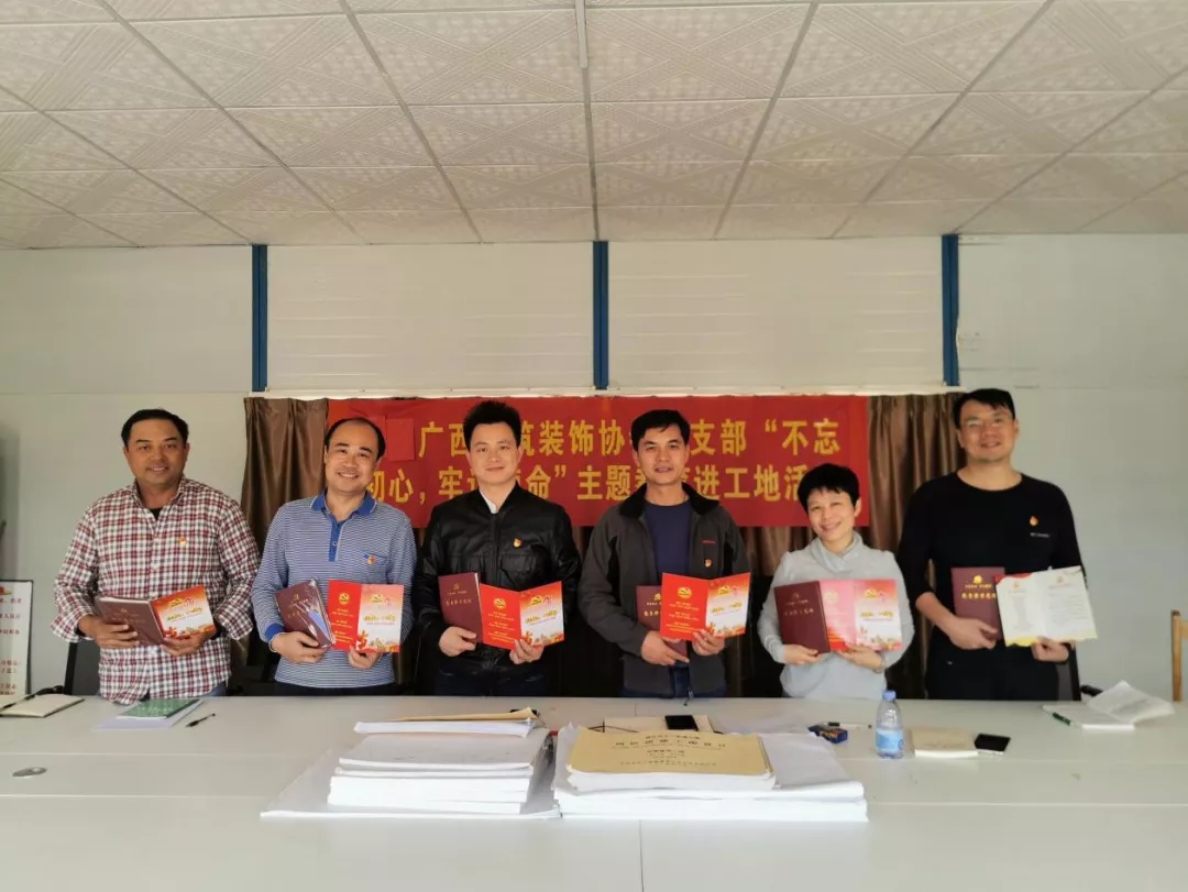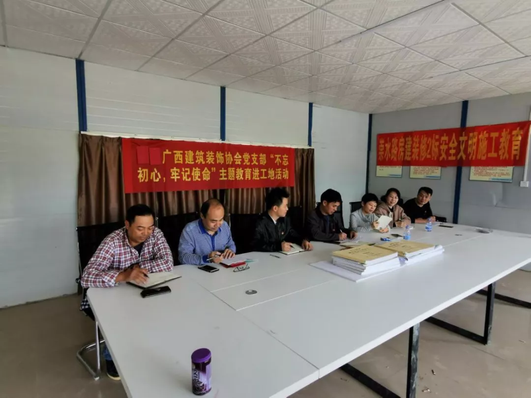 11月21日上午,结合协会支部第2党小组党员长期驻工地的实际情况,协会支部全体党员及入党积极分子,赴第2党小组龙州项目部,开展“不忘初心、牢记使命”主题教育进工地活动。在项目部,召开支部党员大会,一起学习“不忘初心、牢记使命”主题教育相关文件精神,学习《习近平关于“不忘初心、牢记使命”论述摘编》,结合学习体会和工作实际,畅谈工作感悟。会议邀请工地项目经理及工人代表座谈,宣传“不忘初心、牢记使命”主题教育活动的相关精神,并对在“不忘初心、牢记使命”主题教育活动中收集到的问题清单进行反馈剖析。支部党员之间深入谈话谈心,开诚布公地谈问题、找原因、想对策、提意见,彼此交换看法、沟通思想,全方位、多层次听取意见和建议,分析典型事例,讨论下一步整改措施。