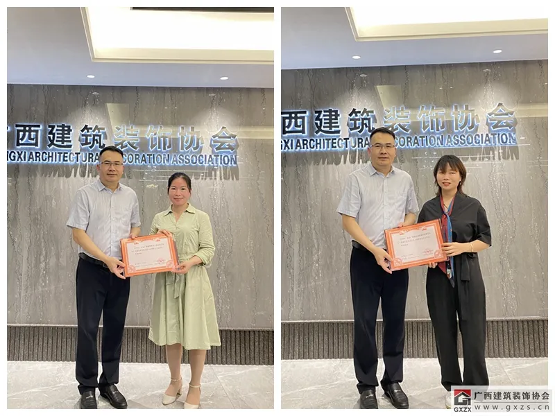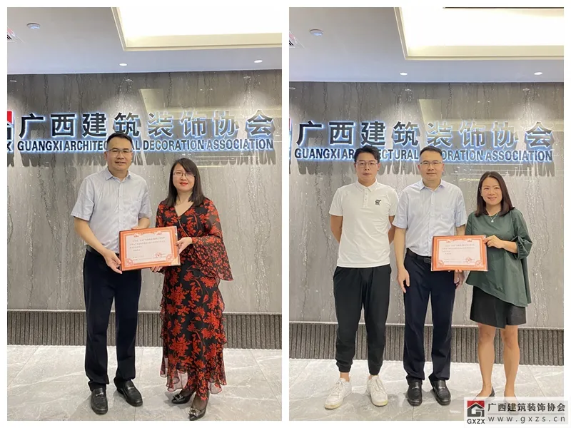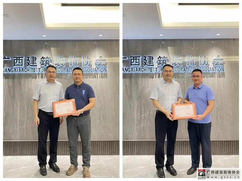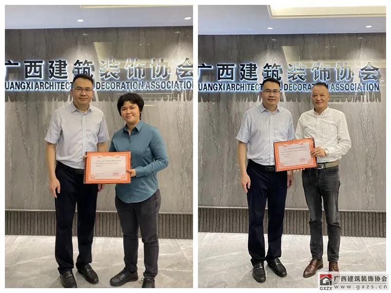 右图 庞耀国会长(左)为广西奇佳建筑设计有限公司设计部经理卢辉凤授牌