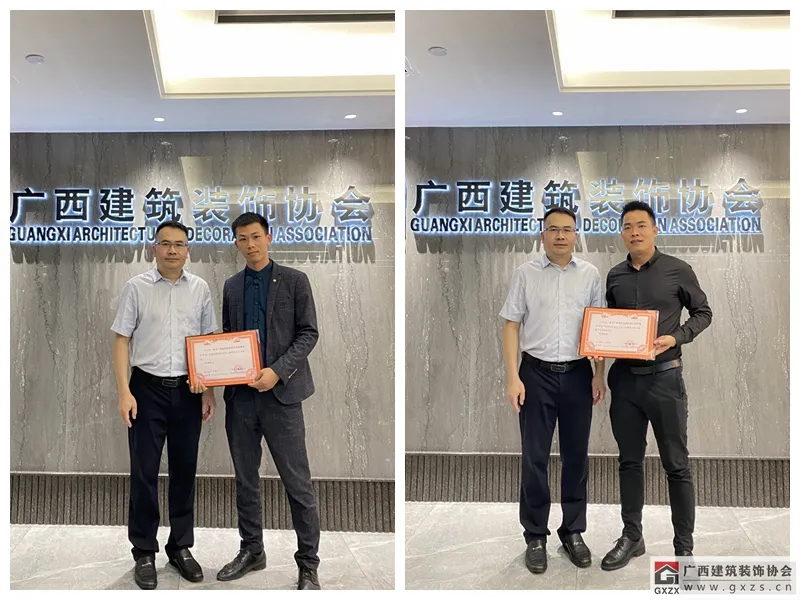 左图 庞耀国会长(左)为广西美饰美家装饰工程有限公司人力总监吴冰授牌