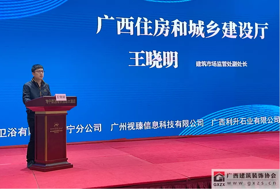 广西住房和城乡建设厅建筑市场监管处副处长王晓明做指导讲话。王晓明在讲话中对本次培训班的成功举办表示祝贺,广西建筑装饰行业专家库历届专家利用深厚的专业知识,推动广西建筑装饰行业发展,提升协会服务质量和精细化水平,为政府部门和会员单位提供高质量专家服务,协助人民群众维护自身权利方面发挥的作用表示认可。他指出,行业专家参加必要的专业培训,具有重要意义。王晓明同时对广西建筑装饰企业提出了四点要求:一是号召各装饰企业积极参与自治区住建厅主导的乡村风貌提升工作,这项工作是当前自治区住建厅的首要任务,计划投入数十亿元资金,在未来几年内对广西农村人居环境进行整治,提升乡村风貌,预计会涉及大量的装饰装修方面的工作,对各装饰企业是一个开展业务的好机会。二是积极参加广西建筑业产值统计工作,以便政府能够及时、准确地掌握广西装饰行业产值的真实情况,制定相应的发展政策。他再次强调,产值统计工作不涉及税收,各企业的产值数据将受到保护,不会外泄。三是继续做大做强广西装饰装修行业,提高广西装饰装修行业知名度,通过行业龙头企业的引领作用,加快发展广西装饰装修行业。四是继续做好广西建筑装饰工程优质奖评选工作,严格评选出更多精品工程,打造“广西装饰”品牌,提升广西装饰装修行业在全国的影响力。