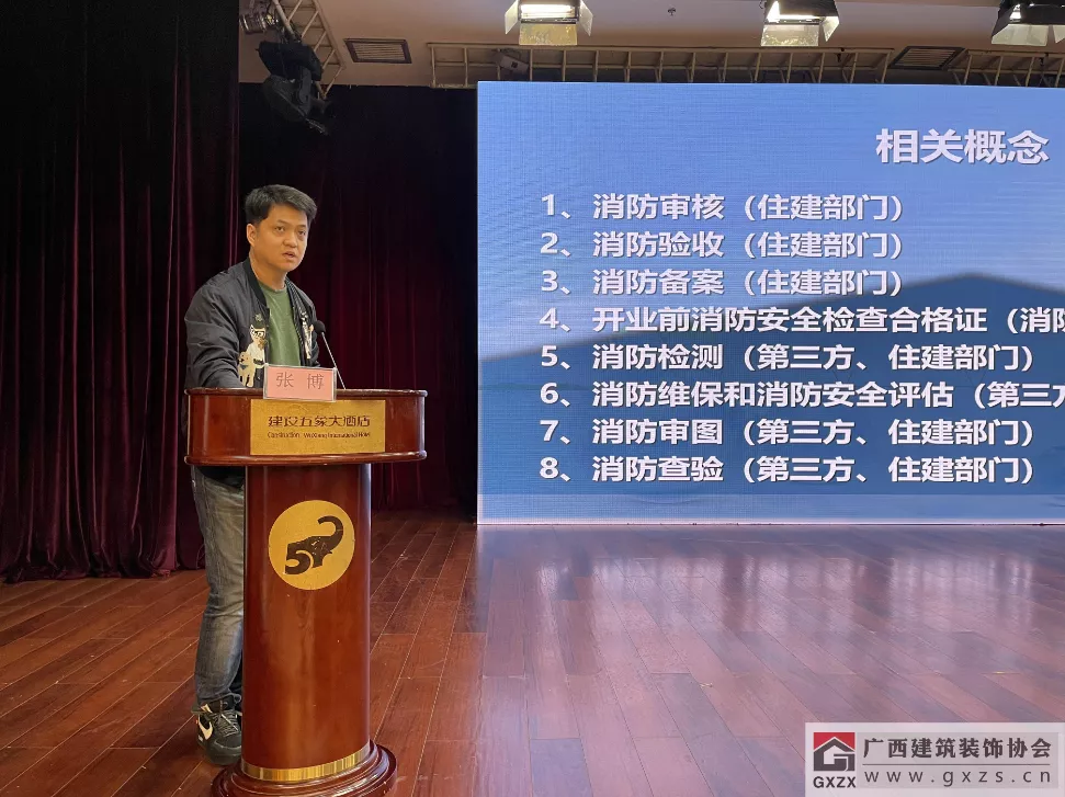 针对企业在建筑工程消防设计审查及验收的职责交由住建部门来管理后,因为对相关的政策不了解而带来的困惑,协会邀请广西中旭博通消防科技有限公司总经理、广西建设工程消防协会副会长张博对建筑装饰工程施工消防报建必备手续注意事项进行介绍。
