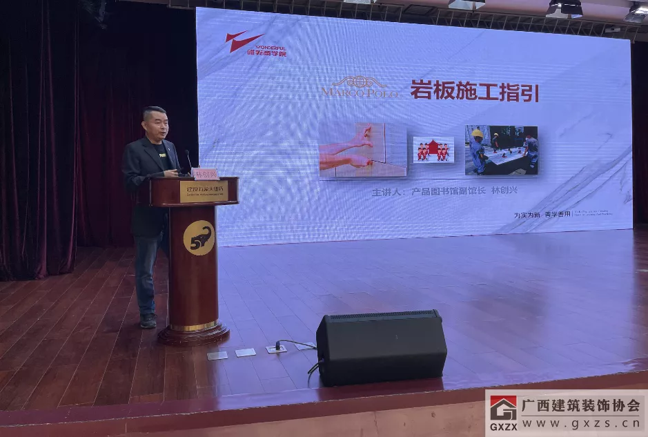 广东马可波罗陶瓷有限公司产品图书馆副馆长林创兴在会上介绍了“马可波罗”瓷砖中一种新的新型材料,岩板施工工艺指南,根据岩板的产品特性对其施工工艺进行了说明。