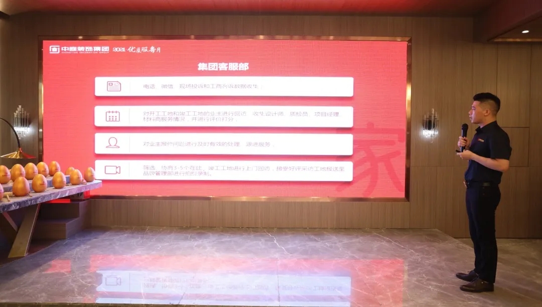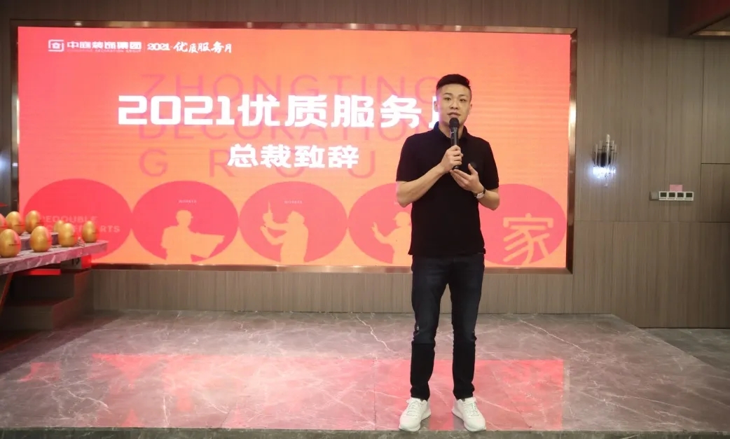 会议伊始,集团总裁丁胡上台致辞。丁总裁表示,集团每年都开展“优质服务月”活动,就是为了督促集团员工们持续贯彻“以客户为中心”的服务原则,想客户之所想,及客户之所及,以专业的形象打造有品质的家装品牌,为客户带来温暖、舒适的装修体验。