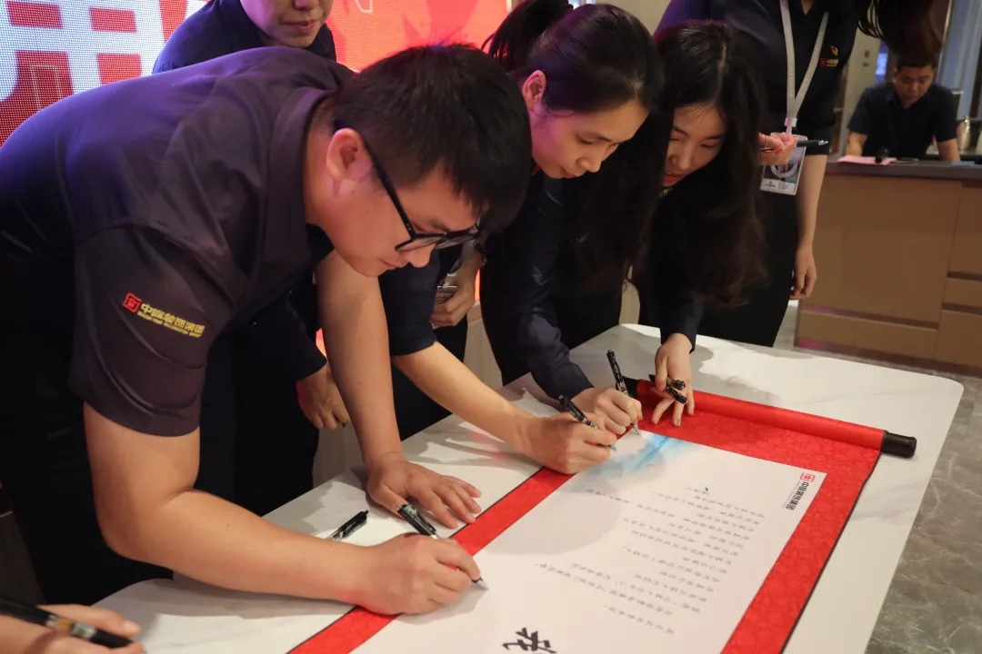 集团领导、各部门负责人分别上台在承诺卷轴上签名并合影留念。