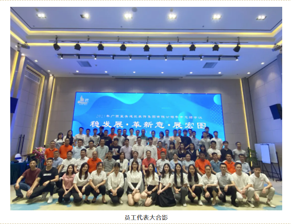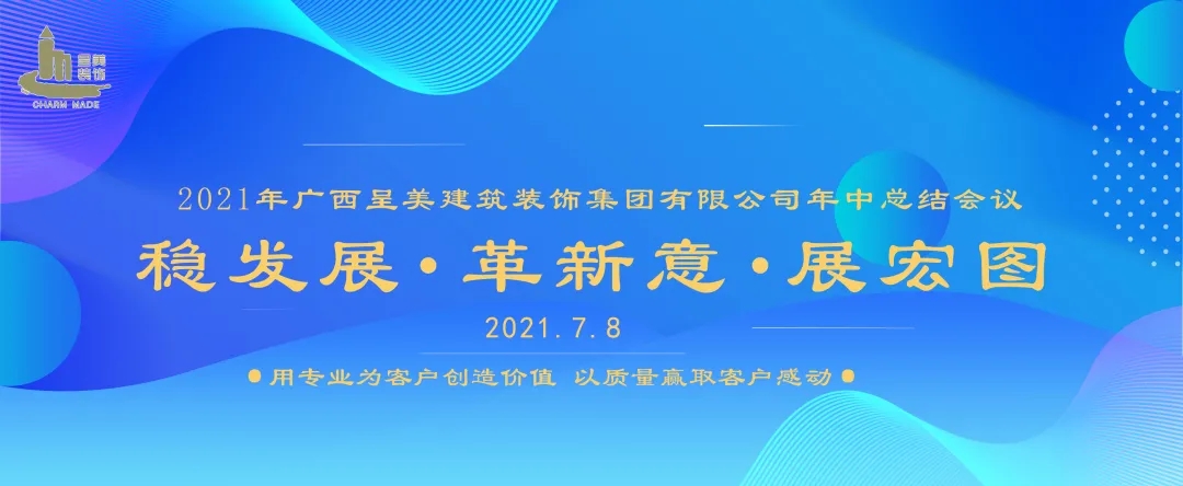 7月8日,广西呈美建筑装饰集团有限公司2021年以“稳发展 革新意 展宏图”为主题的年中总结会议在南宁景都国际大酒店顺利召开。会议对公司各部门、各项目部上半年工作进行充分分析总结,对下半年工作进行展望部署。集团公司董事长兼总经理黄运东、副总经理陈良勇、副总经理黄丕稳、总经理助理刘雅俊、陈琼珍及各部门负责人及分公司负责人:朱永深、蒋宏贵、唐志鹏、黄建华、王春红等及公司员工代表出席了本次会议。