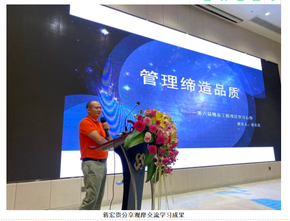 今年四月份,经营技术管理部经理蒋宏贵、设计院副院长朱永深、工程一部经理唐志鹏一起参加了中国建筑装饰协会在青岛举办的《第五届全国建筑装饰行业科技创新大会暨第六届精品工程项目经验交流会》,会议上,他们也为公司全体员工分享了精彩的观摩学习成果。