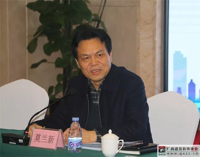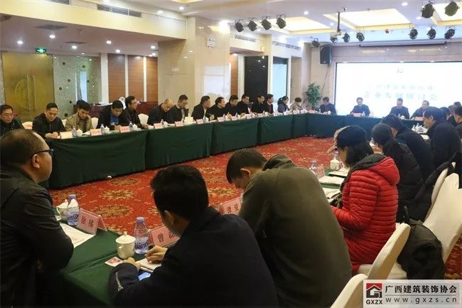 1月3日下午,由广西住房和城乡建设厅建筑市场监管处、勘察设计管理处指导,广西建筑装饰协会主办的广西建筑装饰行业企业发展研讨会在广西建设大厦金象厅召开,广西住房和城乡建设厅副巡视员莫兰新、建筑市场监管处副调研员蓝俊、勘察设计管理处副处长李文翔出席研讨会并讲话。广西建筑装饰协会会长庞耀国主持会议。协会支部书记、副会长兼秘书长黄雪心,副会长:广西华蓝建筑装饰工程有限公司董事长朱建宇、广西华辉装饰集团有限公司董事长杨景忠、广西呈美建筑装饰集团有限公司董事长黄运东、金鼎幕墙股份有限公司董事长李钟金、广西英特装饰工程有限责任公司董事长李军、广西美力时装饰工程有限公司董事长谢嘉,副秘书长兼施工委主任谭谦,办公室主任陈雪玲,以及协会各分会负责人,并特邀总承包公司、专业承包公司、高等院校、家装公司、设计机构等会员企业的负责人共45人参加了研讨会。