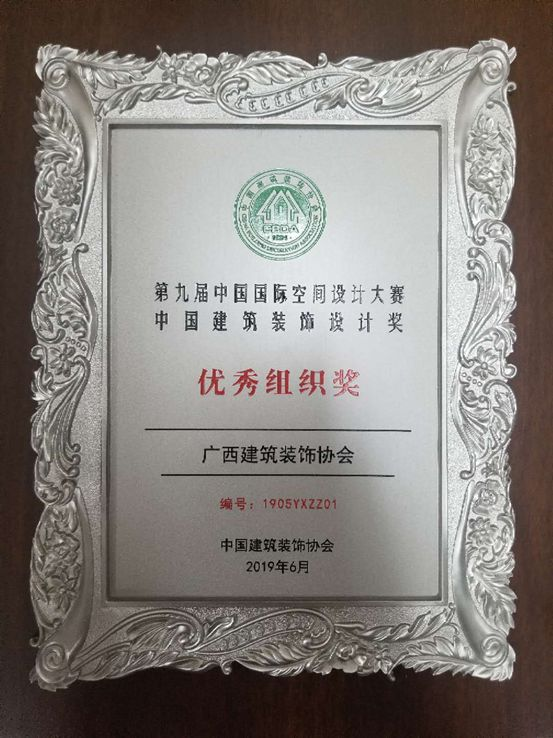 广西建筑装饰协会在中国建筑装饰协会的支持与指导下,承办本次设计大赛设计大赛广西赛区赛事,积极组织广西地区会员企业及设计师参赛。在颁奖典礼上,广西建筑装饰协会获得了由中国建筑装饰协会颁发的“优秀组织奖”,这也是本次赛事主办方中国建筑装饰协会对广西建筑装饰协会组织工作的认可和高度评价。