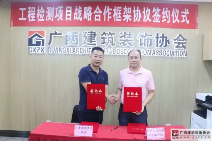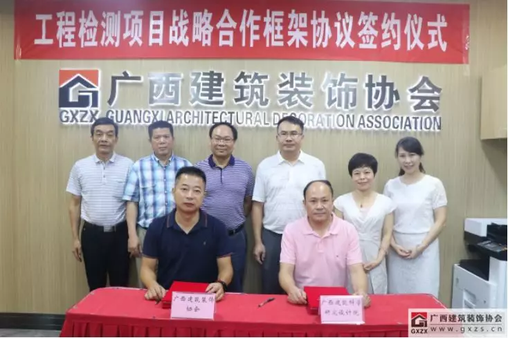 2019年7月8日,为了更好地服务协会会员企业,本着真诚合作、优势互补的原则,广西建筑装饰协会与广西建筑科学研究设计院,在广西建设大厦一楼协会信息中心办公室举行了“工程检测项目战略合作框架协议签约仪式”。