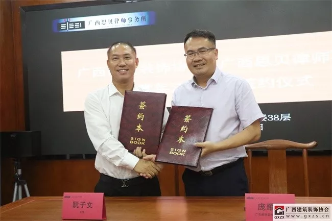 广西建筑装饰协会会长庞耀国与广西思贝律师事务所主任阮子文代表双方签约