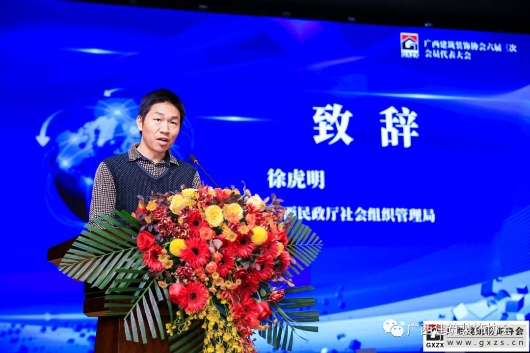 广西民政厅社会组织管理局徐虎明在致辞中对广西建筑装饰在自治区民政厅开展的2019年全区性社会组织评估工作中,再次获评五A级社会组织表示热烈祝贺。希望协会在今后工作中发挥五A级社会组织的品牌作用,全面提高运用制度干事创业、服务行业的能力和本领,切实把协会建设成党和政府信赖的社会力量和会员之家。