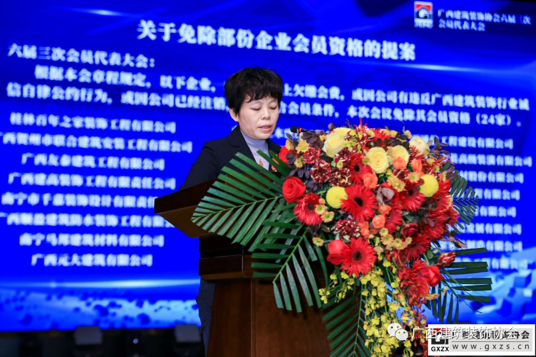 协会党支部书记、副会长兼秘书长黄雪心主持审议《关于调整广西建筑装饰协会第六届理事会副会长部分组成人员的提案》和《关于免除部分企业会员资格的提案》。24家会员企业,或因2年以上欠缴会费,或因公司有违反广西建筑装饰行业诚信自律公约行为,或因公司已经注销,不再符合会员条件,根据协会章程,本次会议审议通过免除其会员资格。