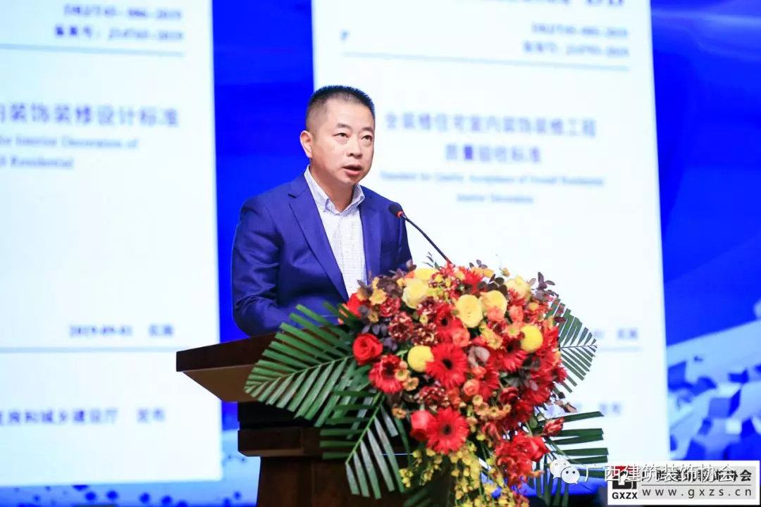 协会副秘书长兼施工委主任谭谦对《全装修住宅室内装饰装修工程质量验收标准》和《全装修住宅室内装饰装修设计标准》做了解读。2017年开始,广西建筑装饰协会参与主导编制完成了《全装修住宅室内装饰装修工程质量验收标准》和《全装修住宅室内装饰装修设计标准》,这两个标准已于2019年9月1日起开始实施。适合广西建筑装饰装修技术水平和特点的这两个地方标准的发布,将对我区在全装修住宅的设计、施工和验收等方面的应用和行为起到规范和指导作用,对促进广西住宅产业化发展具有积极和深远的意义。