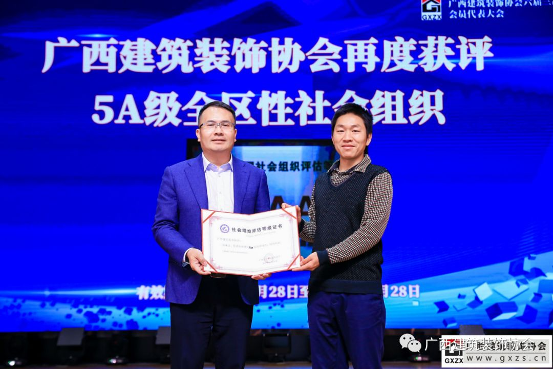 2019年,在自治区民政厅开展的全区性社会组织评估工作中,广西建筑装饰协会以扎实的基础条件、规范的内部治理、优质的行业服务,高度的社会评价,再次获评五A级社会组织,成为2019年广西17个通过5A级评估的社会组织之一。会上,自治区民政厅社会组织管理局向协会颁发了“五A”社会组织证书。