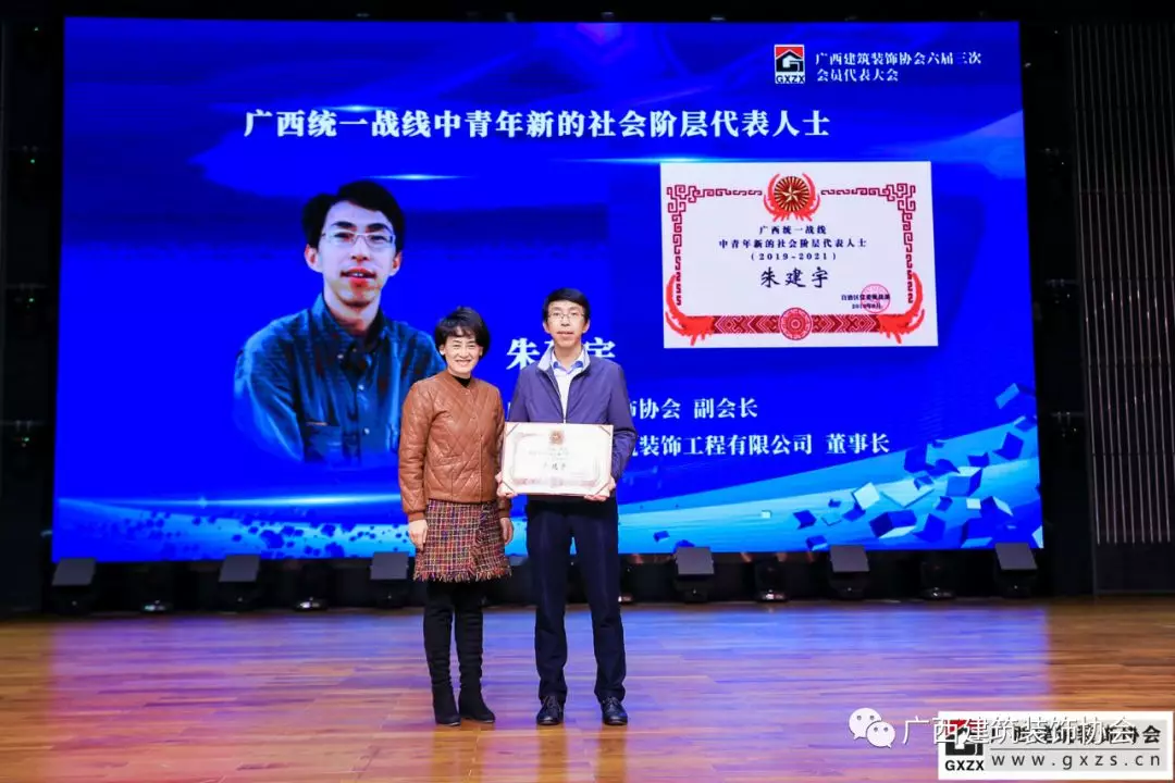 会上,自治区住建厅行业党委副书记、纪委书记邹丽萍向协会副会长朱建宇颁发了“广西统一战线中青年新的社会阶层代表人士荣誉证书”。