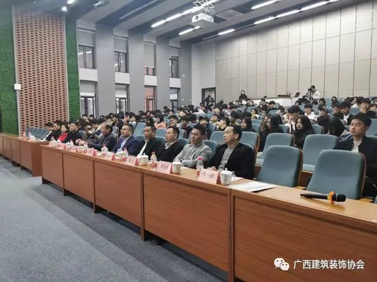 中国建筑装饰协会副会长、中华建筑报社执行社长陈新,广西建设职业技术学院院长彭红圃,广西建筑装饰协会会长庞耀国,以及协会副会长、广西三源装饰工程有限公司总经理陈继祥,协会副会长、广西华辉装饰集团有限公司董事长杨景忠,协会副会长、广西建林装饰工程有限责任公司董事长黄闪,协会副会长、广西呈美建筑装饰集团有限公司董事长黄运东等企业家、协会专家、艺术设计系师生代表,共计200余人参加了活动。