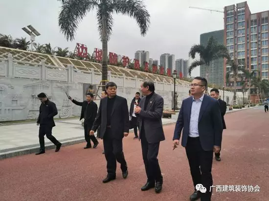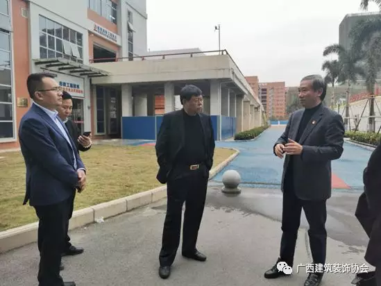 中国建筑装饰协会陈新副会长(左三)、广西建设职业技术学院院长彭红圃(右二)、广西建筑装饰协会会长庞耀国(右一)参观校园