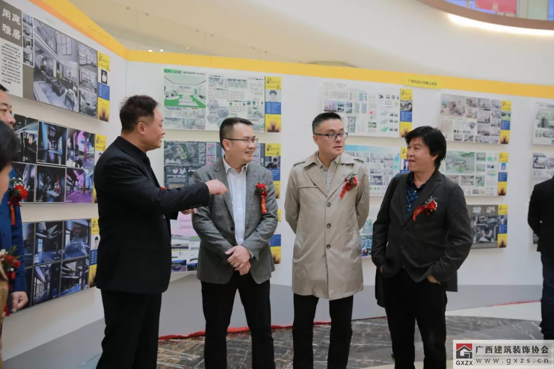 广西建筑装饰协会会长庞耀国(左二)柳州建筑装饰职业教育集团/柳州城市职业学院副院长刘洪波(右二)柳州市建筑装饰协会会长伍卫平(右一)红星·欧丽洛雅柳州商场总经理邓玉明(左一)参观校企联合设计展