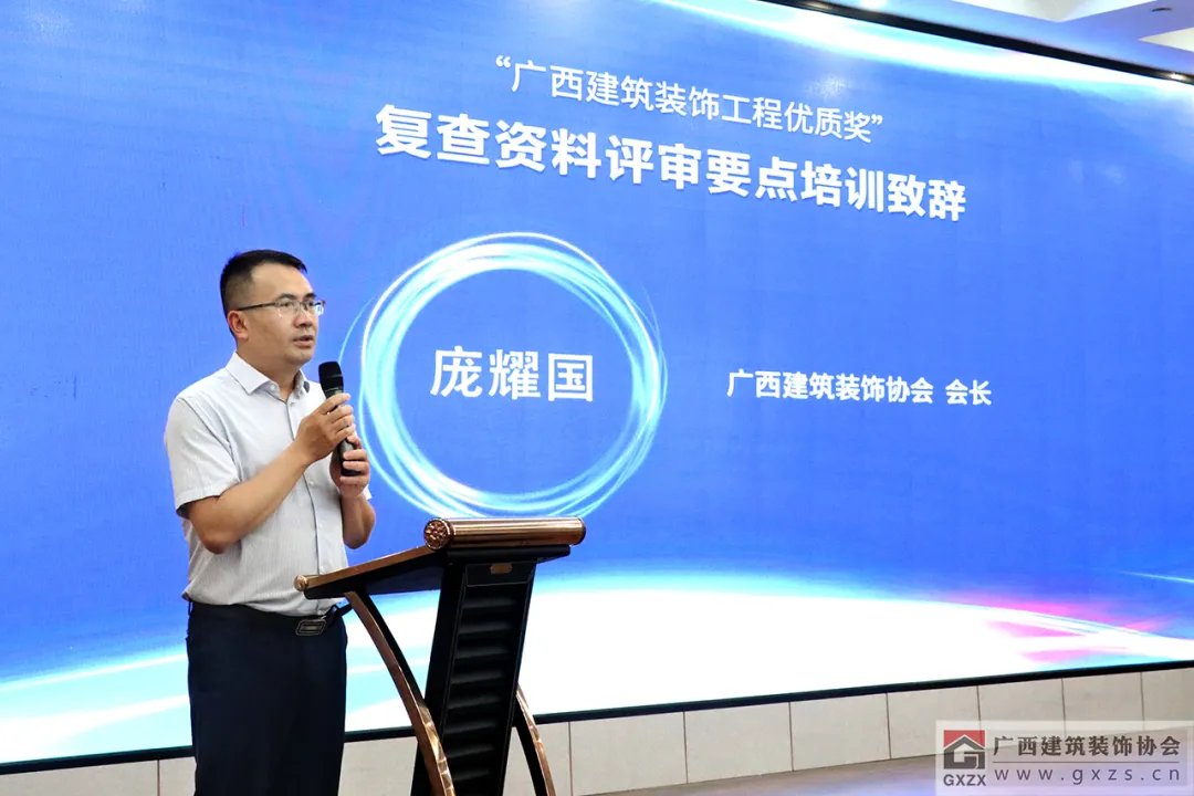 倾听“老师之言”首先,协会会长庞耀国在开班仪式上致辞。庞会长强调了“广西建筑装饰工程优质奖”复查资料的重要性。希望通过本次培训,加强企业对整理和准备评优资料的重视性,提高评优资料的规范性。