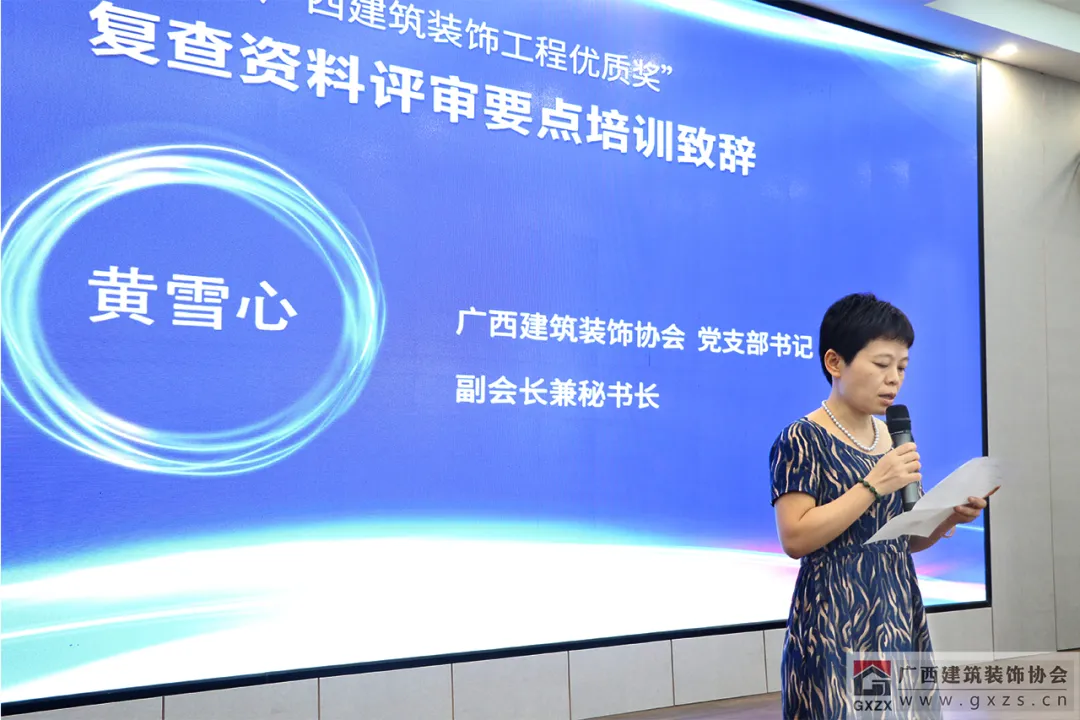 党支部书记、副会长兼秘书长黄雪心发表讲话,她指出,广西建筑装饰协会作为该奖项的评审单位,一直以来秉承严肃、认真的态度开展评选工作,严格审查申报资料的真实性,保证评选工作的公平性与公正性,希望各申报单位严格遵守评选纪律,坚决杜绝作假的现象发生,和协会一起,维护好广西建筑装饰工程优质奖良好的信誉。