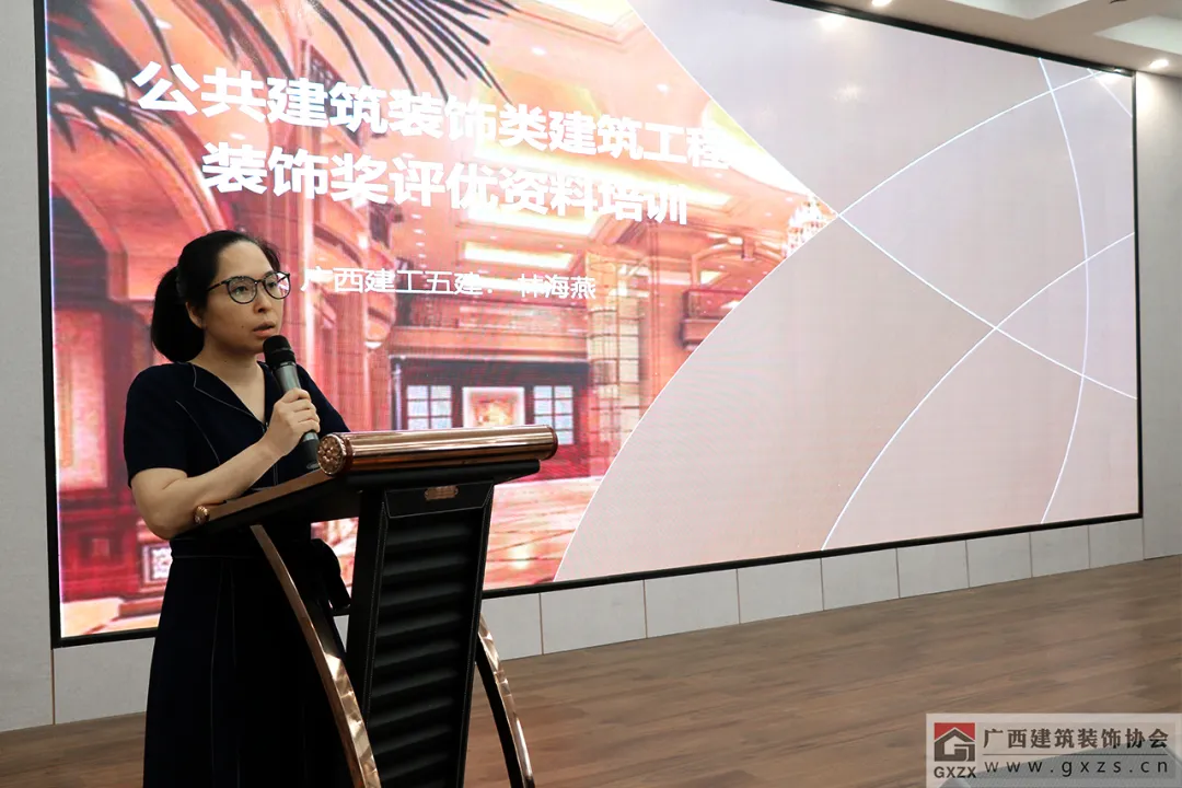 广西建筑装饰协会公共建筑装饰类高级专家、广西建工集团第五建筑工程有限责任公司南宁分公司质量技术部副经理、高级工程师——林海燕,讲述了“广西建筑装饰工程优质奖”评优资料收集整理与注意事项。