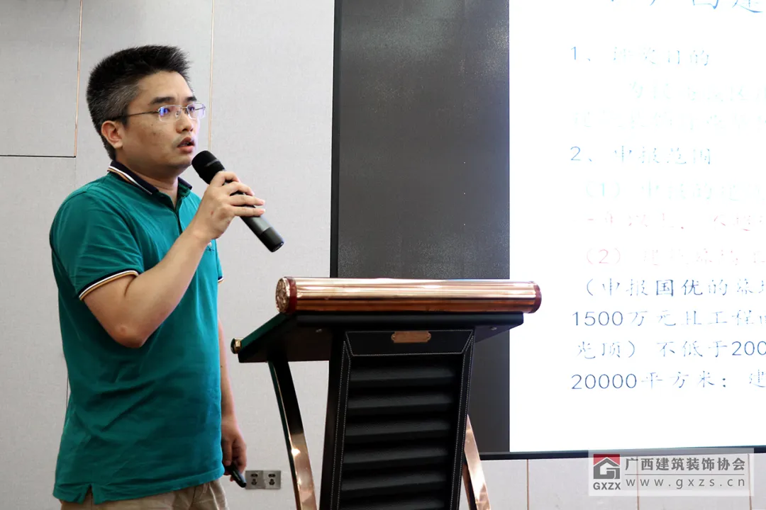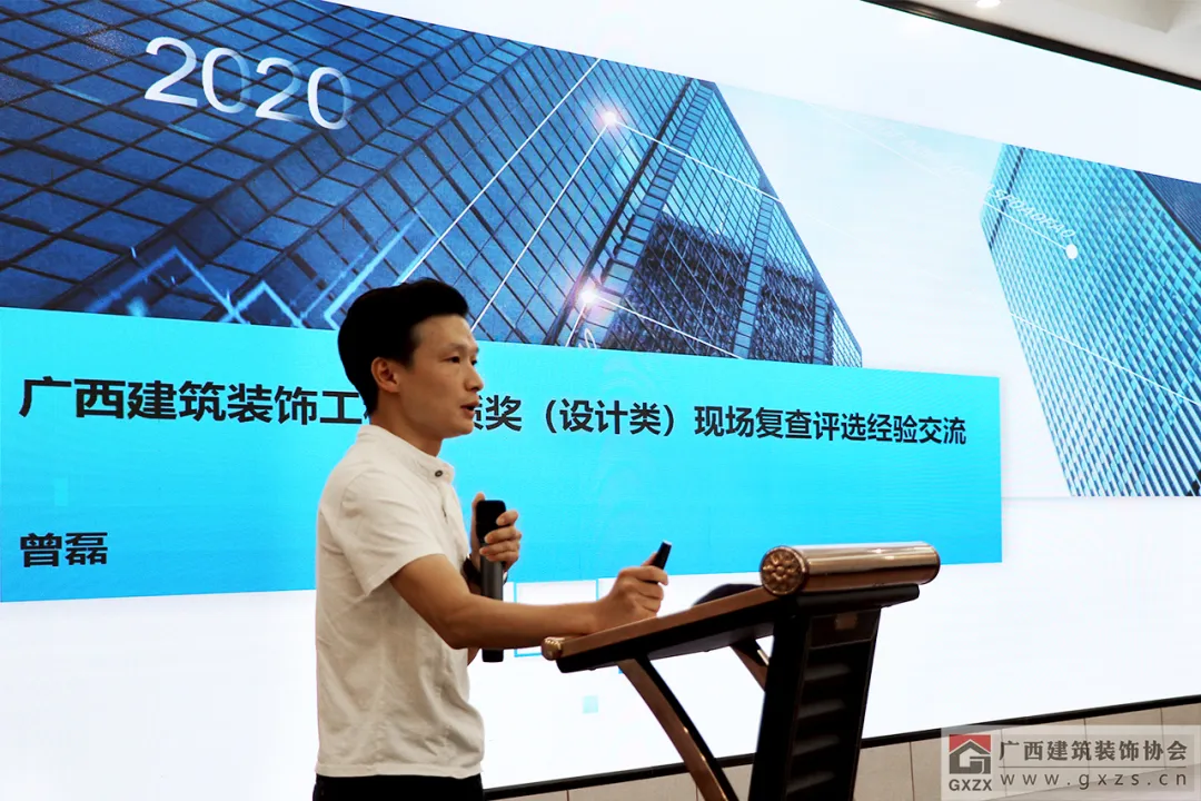 广西建筑装饰协会设计分会副秘书长、广西建筑科学研究设计院建筑装饰设计所 所长——曾磊,讲述了“广西建筑装饰工程优质奖”(建筑装饰设计类)评优的要求和注意事项。