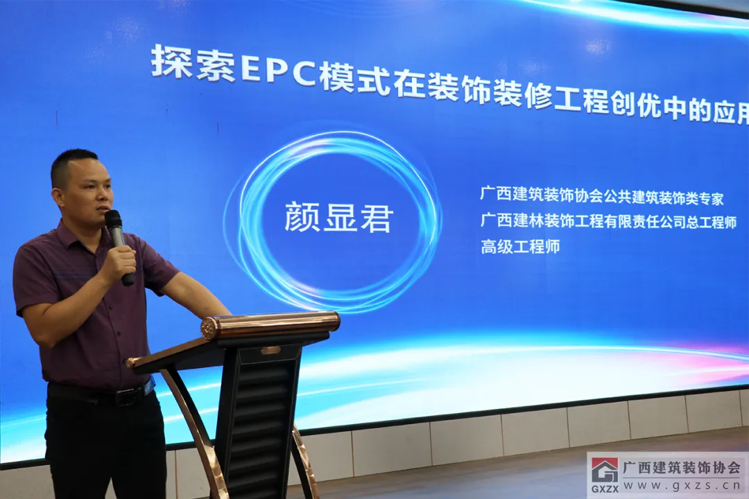 广西建筑装饰协会公共建筑装饰类专家、广西建林装饰工程有限责任公司总工程师、国家一级注册建造师、高级工程师——颜显君,讲述了“探索EPC模式在装饰装修工程创优中的应用”。