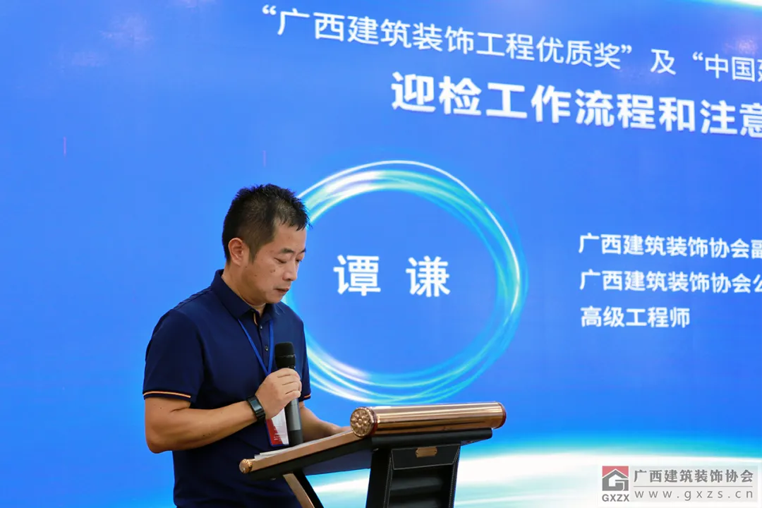 最后,广西建筑装饰协会副秘书长兼施工委主任、广西建筑装饰协会公共建筑装饰类高级专家、国家一级注册建造师、高级工程师——谭谦,为大家讲述了“广西建筑装饰工程优质奖”及“中国建筑工程装饰奖”迎检工作流程和注意事项 。