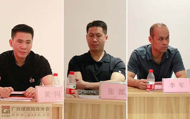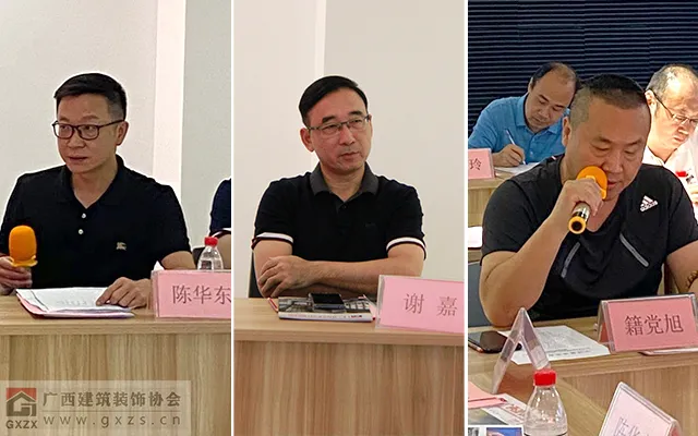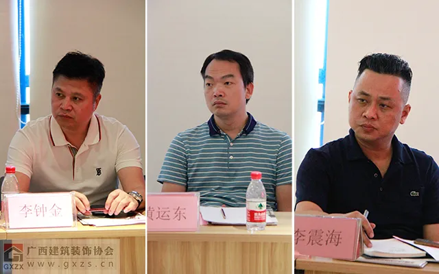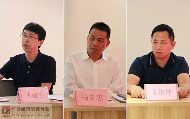 从左至右:副会长 广西建工集团桂港建筑装饰有限公司董事长陈华东;副会长 广西美力时装饰工程有限公司 董事长 谢嘉;副会长 防城港市建筑装饰协会 会长 籍党旭