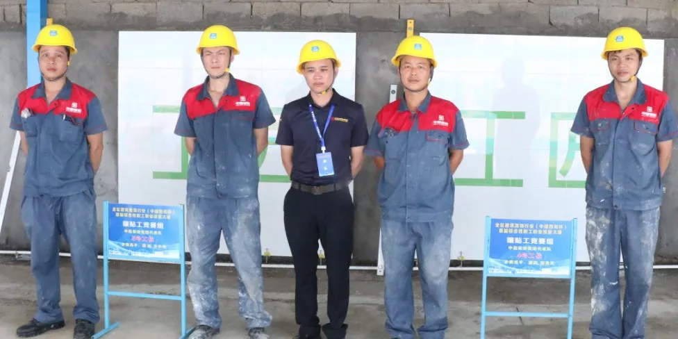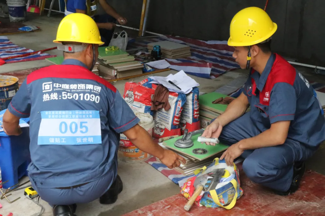 协会副秘书长兼施工委主任谭谦担任镶贴工竞赛裁判组组长,施工委副主任蒙德攀为裁判之一。镶贴工竞赛也是协会组织参赛的会员企业参与的主要竞赛项目,参赛的10组选手中,三源装饰、中庭装饰、华辉装饰等三家企业分别派出1个、2个、3个小组共计6组12名选手参加竞赛,参赛人员都是经验丰富的熟练工人,在比赛中沉着冷静,按部就班地进行测量、切割、排版、贴砖、镶嵌等操作。最终,来自中庭装饰公司的颜新、谢勇军小组勇夺镶贴工比赛第一名,华辉装饰公司的宾善海、宾善龙小组获得第二名。三源装饰公司以及华辉装饰公司、中庭装饰公司的其他参赛小组获得了第4-7名的成绩。