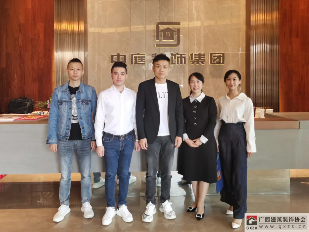中庭装饰总裁丁胡(中)、副总裁张浩熙(左二)、总经理邹恒元(左一)与陈雪玲主任(右二)梁珂茵(右一)合影广西中庭装饰工程集团有限责任公司是一家集装饰设计、工程施工、建材销售、家具生产、文化传媒、商贸、 投资于一体的高速发展的综合性实业联合体。旗下企业主要从事家居、办公楼、别墅、酒店、会所、商业空间的设计及施工。秉承“源于社会,回报社会”的社会责任理念,积极参与社会公益事业,将企业的公民理念延伸至扶贫、教育、环保、公共卫生等领域,通过持续发展和服务创新为客户带来更新更好的服务体验,努力实现社会的和谐发展,让更多的人感受中庭的温暖。