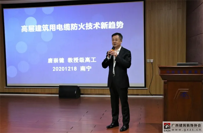 广西纵览线缆集团有限公司总裁、教授级高级工程师唐崇健进行了题为《高层建筑用电缆防火技术新趋势》的分享。唐崇健总裁是国家电线电缆标准化技术委员会委员,是20多项电线电缆国家标准及行业标准的主要起草人,是国内电线电缆行业的知名专家学者。