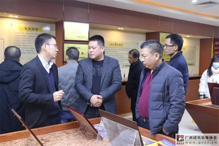 协会建材分会会长黄嗣贵(前左)、建材分会副会长林怀旭(前中)认真聆听产品介绍