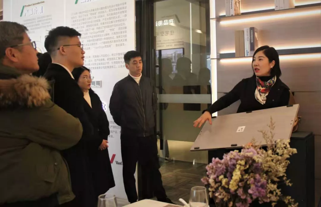 南宁市梵高阁装饰有限责任公司副总经理王媛媛(左一)向参加活动的企业代表介绍了梵高阁墙变系统研发以及旗下系列产品,并带领参加活动的企业代表现场上手体验。