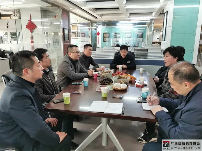 2020年12月30日,庞会长和协会副会长、广西建林装饰工程有限责任公司董事长黄闪,监事长、广西英泰装饰有限公司总经理黄加仕,副秘书长兼施工委主任谭谦等一行前往柳州,到访广西雅仕达建设工程有限公司,聆听了雅仕达公司董事长伍卫平(兼任柳州市建筑装饰协会会长)对公司整体情况以及柳州市建筑装饰协会开展行业协会工作情况的介绍。庞会长表示,雅仕达公司作为柳州装饰行业头部企业,今后有能力、有机会多为广西装饰行业服务,发挥积极作用。