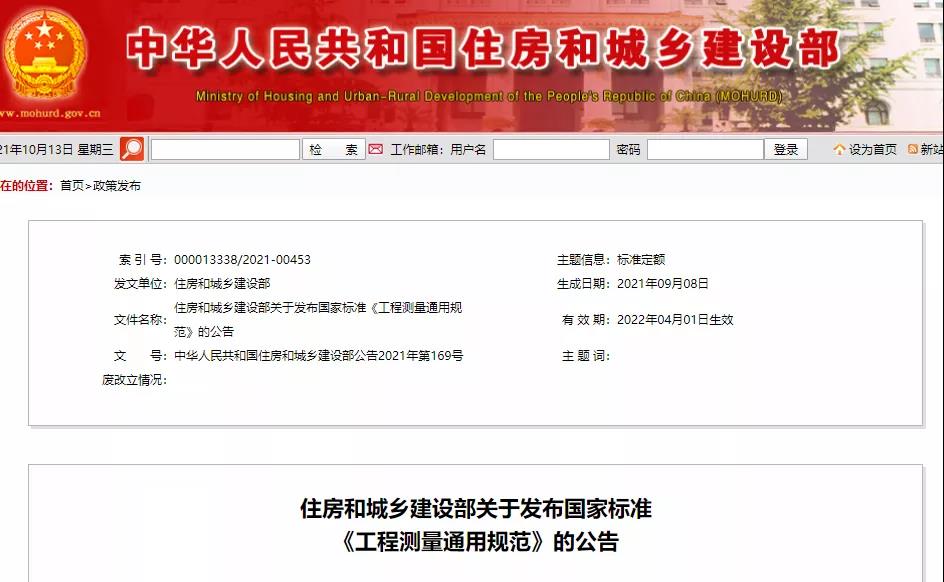 现批准《工程测量通用规范》为国家标准,编号为GB 55018-2021,自2022年4月1日起实施。本规范为强制性工程建设规范,全部条文必须严格执行。现行工程建设标准相关强制性条文同时废止。现行工程建设标准中有关规定与本规范不一致的,以本规范的规定为准。