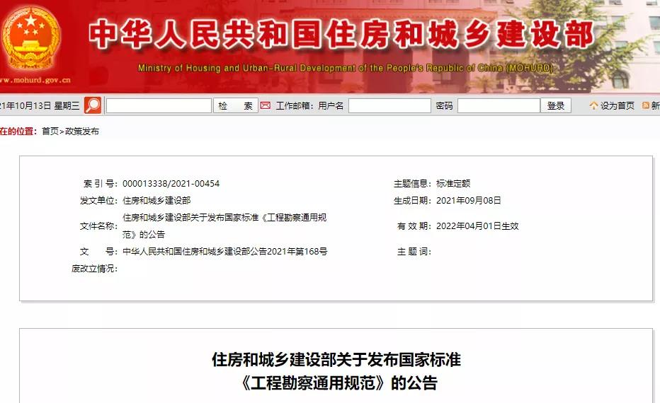 现批准《工程勘察通用规范》为国家标准,编号为GB 55017-2021,自2022年4月1日起实施。本规范为强制性工程建设规范,全部条文必须严格执行。现行工程建设标准相关强制性条文同时废止。现行工程建设标准中有关规定与本规范不一致的,以本规范的规定为准。