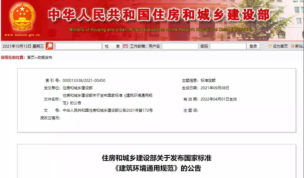 现批准《建筑环境通用规范》为国家标准,编号为GB 55016-2021,自2022年4月1日起实施。本规范为强制性工程建设规范,全部条文必须严格执行。本规范为强制性工程建设规范,全部条文必须严格执行。现行工程建设标准相关强制性条文同时废止。现行工程建设标准中有关规定与本规范不一致的,以本规范的规定为准。