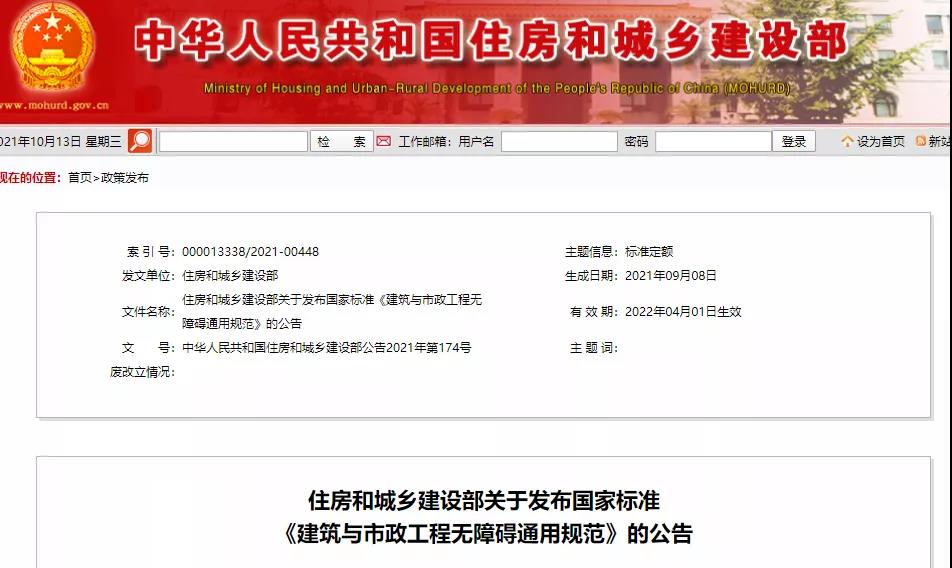 现批准《建筑与市政工程无障碍通用规范》为国家标准,编号为GB 55019-2021,自2022年4月1日起实施。本规范为强制性工程建设规范,全部条文必须严格执行。现行工程建设标准相关强制性条文同时废止。现行工程建设标准中有关规定与本规范不一致的,以本规范的规定为准。