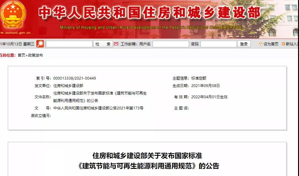 现批准《建筑节能与可再生能源利用通用规范》为国家标准,编号为GB 55015-2021,自2022年4月1日起实施。本规范为强制性工程建设规范,全部条文必须严格执行。现行工程建设标准相关强制性条文同时废止。现行工程建设标准中有关规定与本规范不一致的,以本规范的规定为准。
