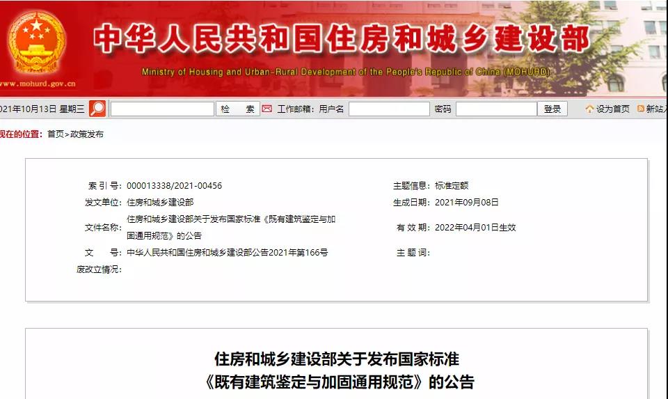 现批准《既有建筑鉴定与加固通用规范》为国家标准,编号为GB 55021-2021,自2022年4月1日起实施。本规范为强制性工程建设规范,全部条文必须严格执行。现行工程建设标准相关强制性条文同时废止。现行工程建设标准中有关规定与本规范不一致的,以本规范的规定为准。