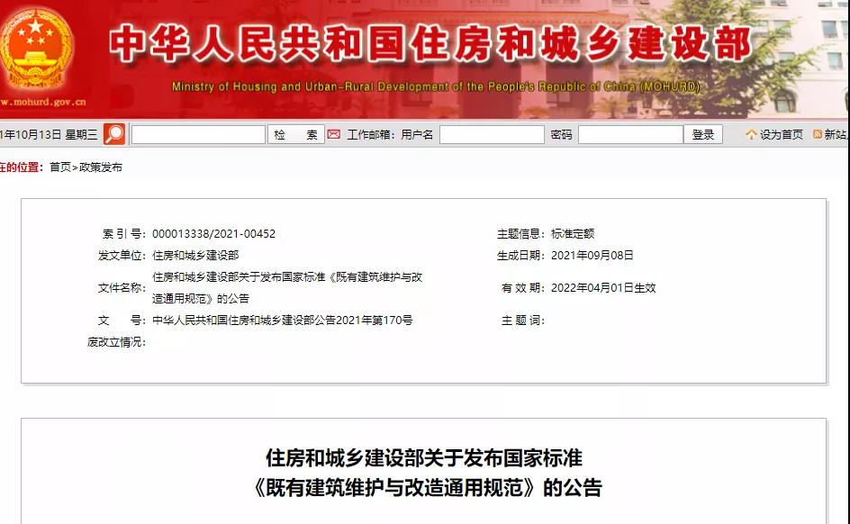 现批准《既有建筑维护与改造通用规范》为国家标准,编号为GB 55022-2021,自2022年4月1日起实施。本规范为强制性工程建设规范,全部条文必须严格执行。现行工程建设标准相关强制性条文同时废止。现行工程建设标准中有关规定与本规范不一致的,以本规范的规定为准。