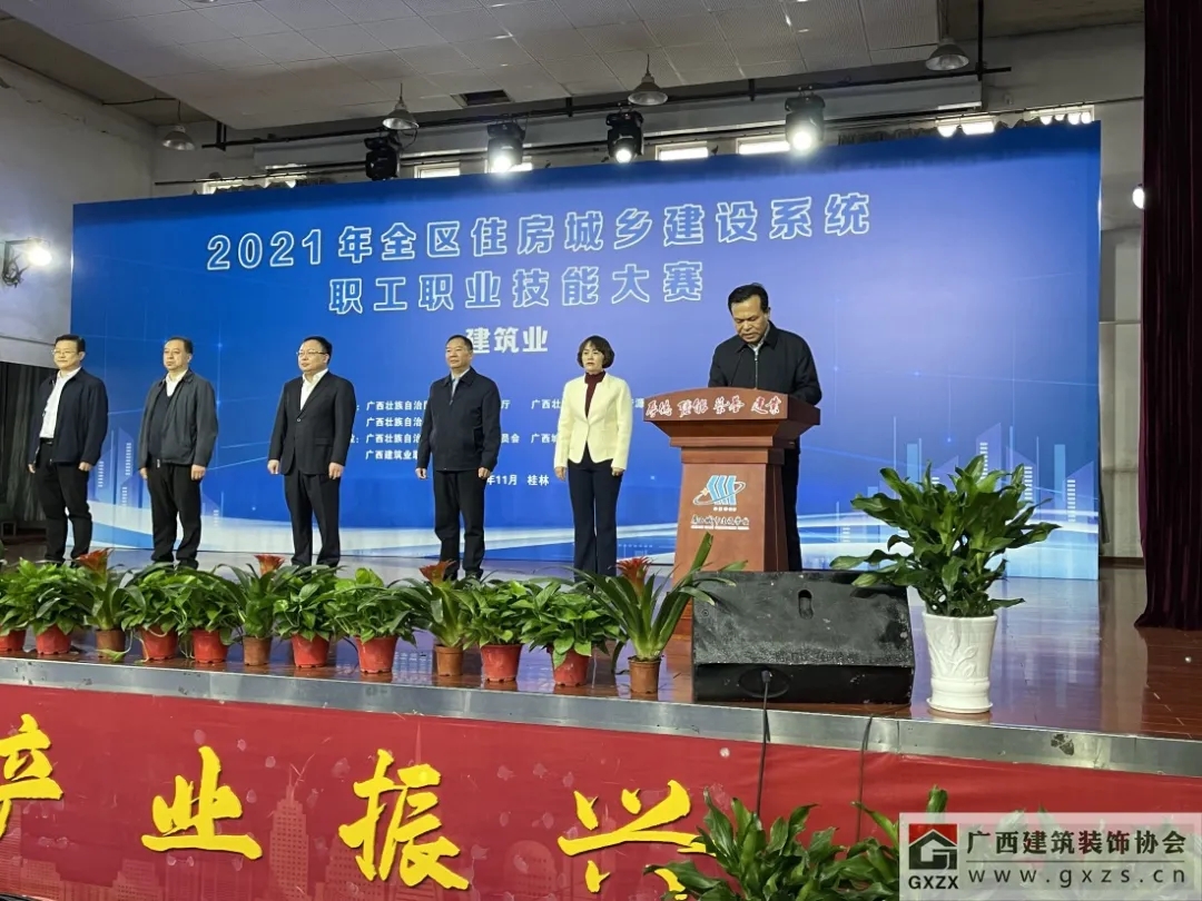 2021年11月17日,“2021年全区住房城乡建设系统职工职业技能大赛(建筑业)”在桂林市广西城市建设学校顺利举行。自治区住房和城乡建设厅厅长、党组书记唐标文,自治区人力资源社会保障厅副厅长蒋劼以及自治区总工会、桂林市的相关领导出席开幕式。