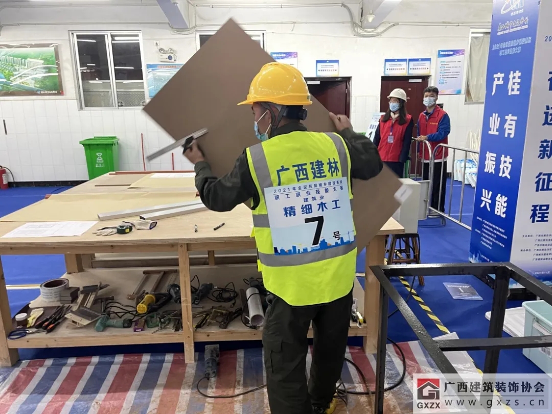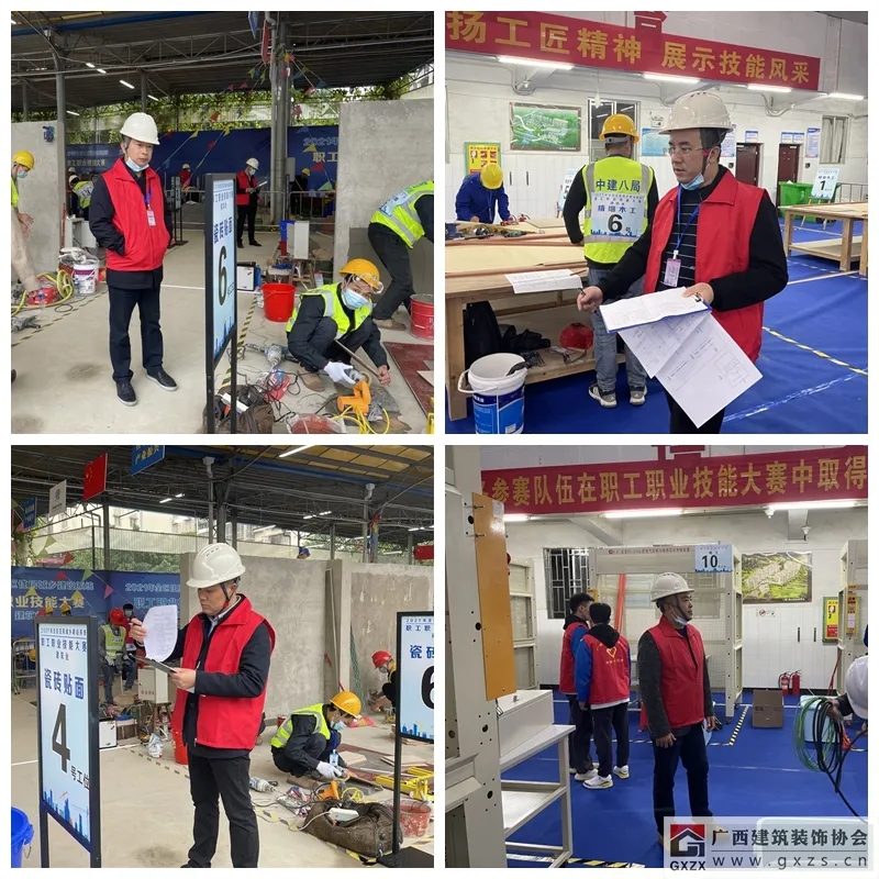本次大赛共设有精细木工、砌筑工、钢筋工、抹灰工、瓷砖贴面、电工六大建筑业项目,各项目分为理论知识考试及操作技能比赛两部分。协会精心组织、积极参与本次大赛,派出了在2021年7月份举办的广西建筑装饰行业职工职业技能大赛中获得单项第一名的三家会员企业选手参加其中精细木工、瓷砖贴面、建筑电工等三个工种的比赛。同时,协会派出4名理论扎实,建筑装饰行业类技能比赛裁判经验丰富的优秀专家担任大赛裁判工作,协会执行秘书长谭谦担任大赛副总裁判长,覃祖荣、颜显君、韦焕明等三位专家分别担任精细木工、瓷砖贴面、建筑电工组比赛的裁判组组长。