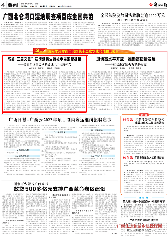 《广西日报》刊发自治区住房城乡建设厅厅长、党组书记唐标文访谈文章《写好“三篇文章” 在增进民生福祉中展现新担当》