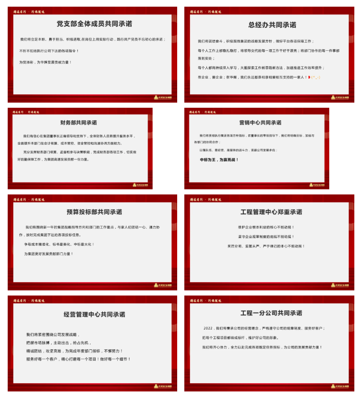 会上,集团各部门、子公司分别对2021年工作及2022年规划做了汇报,总结经验,查找不足,对下一步工作做细致谋划,并庄严立下承诺。承诺就是责任,华辉人将以实际行动兑现承诺:请集团放心,集团发展有我们!请客户放心,打造精品工程有我们!