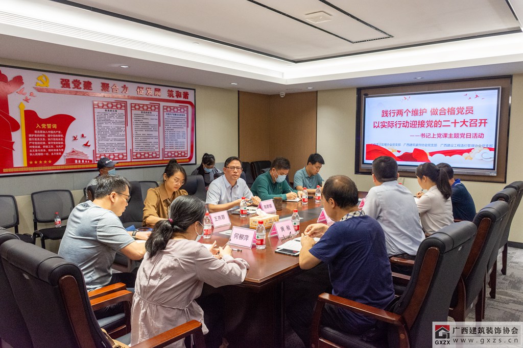为进一步丰富党员教育形式,增强党员教育实践,提高支部凝聚力,推动“三会一课”常态化、规范化,以实际行动迎接党的二十大胜利召开,2022年5月20日下午,住建行业协会部分党支部联合开展党支部书记讲党课活动。广西建筑装饰协会党支部书记黄榆同志、广西建设监理协会党支部书记陈群毓同志、广西建设工程造价管理协会党支部书记王燕蓉同志以及三个党支部全体党员、入党积极分子共20人参加活动。广西建筑装饰协会庞耀国会长以入党积极分子的身份参加活动。